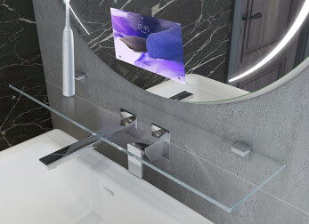Okrúhle zrkadlo do kúpeľne Samsungmôže byť pre vás vybavené poličkou z tvrdeného skla. Môžete naň umiestniť potrebné hygienické prostriedky, napríklad zubnú kefku alebo parfum.